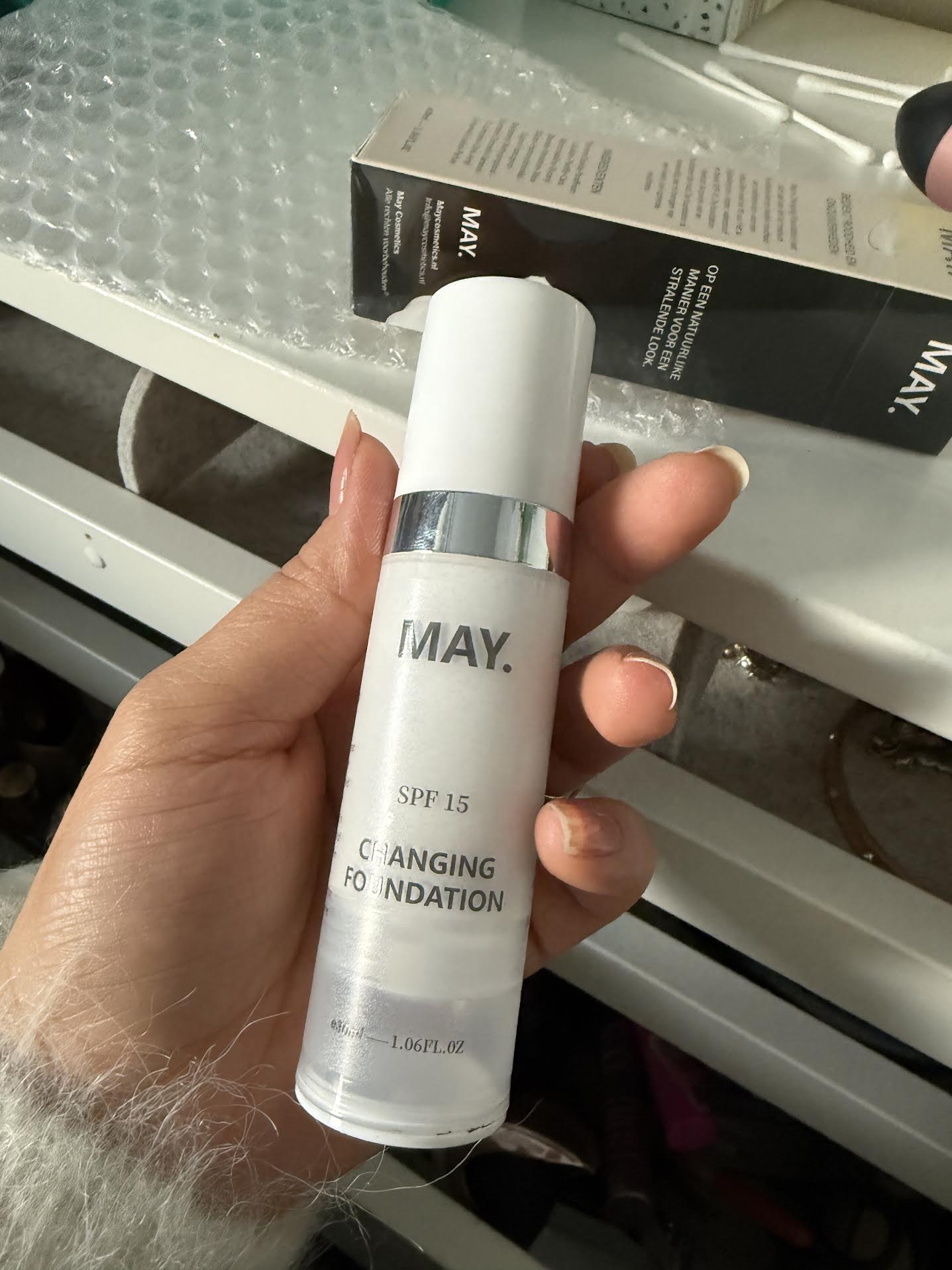1. Meng 4 tot 8 druppels goed met je gebruikelijke dag- of nachtcrème.(Hoe meer druppels je toevoegt, hoe intenser de kleur.)